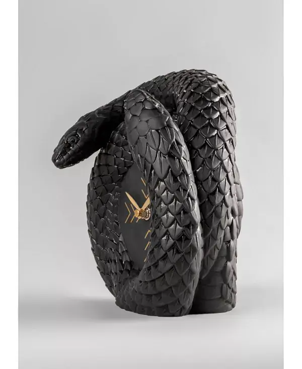 Черные фарфоровые часы с двумя переплетёнными змеями. Матово-чёрные фарфоровые настольные часы из коллекции «Змеи». Змея — завораживающее существо, пробуждающее в людях воображение, страх и любопытство. В разных культурах она является символом жизненного цикла, мудрости и знания, духовности, силы и защиты. В этих часах детализированные тела двух змей создают идеальное обрамление для циферблата.