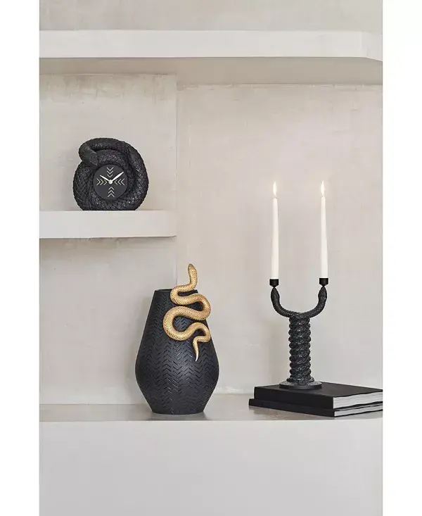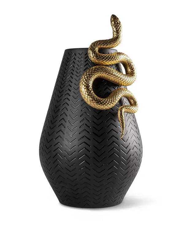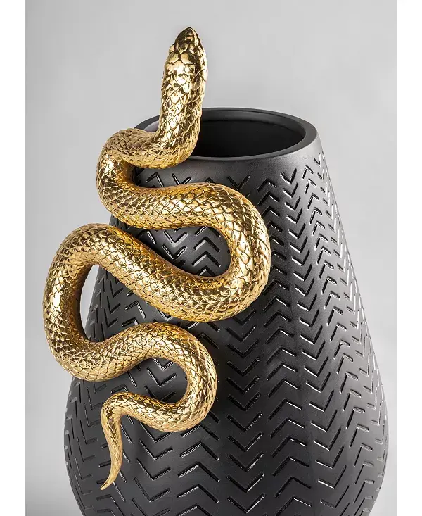 Черная фарфоровая ваза, украшенная змеей с золотистым блеском. Матовая черная фарфоровая ваза из коллекции «Змеи». Змея — завораживающее существо, пробуждающее в людях воображение, страх и любопытство. В разных культурах она является символом жизненного цикла, мудрости и знания, духовности, силы и защиты. Дизайн этого изделия основан на контрасте между чистыми линиями вазы, украшенной строгим черным цветом, и извилистыми движениями змеи, украшенной золотистым блеском.