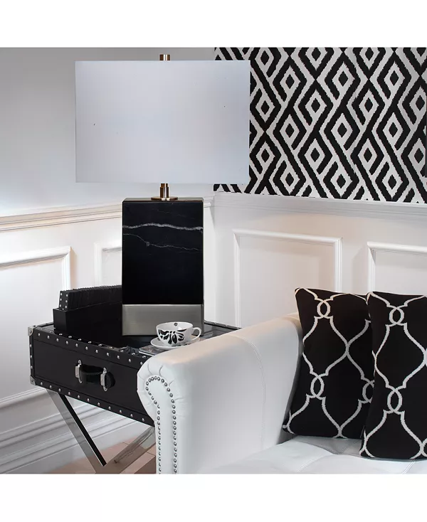 Освежите свое жилое пространство с помощью изысканной настольной лампы Heme от Ren Wil. Темный мраморный блок на блестящей металлической ножке создает изысканный акцент в сочетании с большим прямоугольным абажуром.