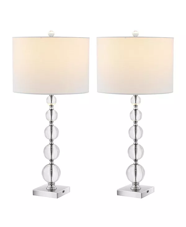 Украсьте консоль в прихожей или столик в гостиной этим гламурным комплектом из двух ламп Liam Stacked Crystal Ball. В комплекте белый льняной абажур и пять прозрачных хрустальных шаров с плавающими оттенками на квадратной прозрачной подставке. Эта настольная лампа оснащена встроенным USB-портом.