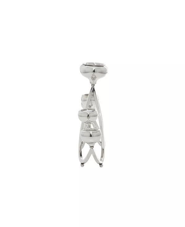 Этот подсвечник имеет каркас в форме канделябра с круглой пластиной и шарообразными ножками