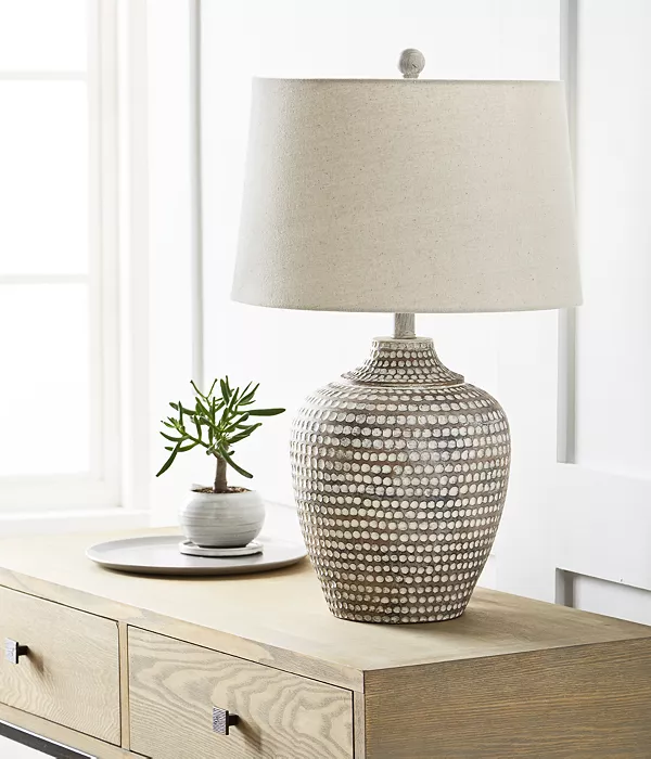 Мягкие, землистые тона подчеркивают узор в горошек, который окутывает основание кувшина настольной лампы Alese от Pacific Coast, предлагая успокаивающее и свежее освещение.