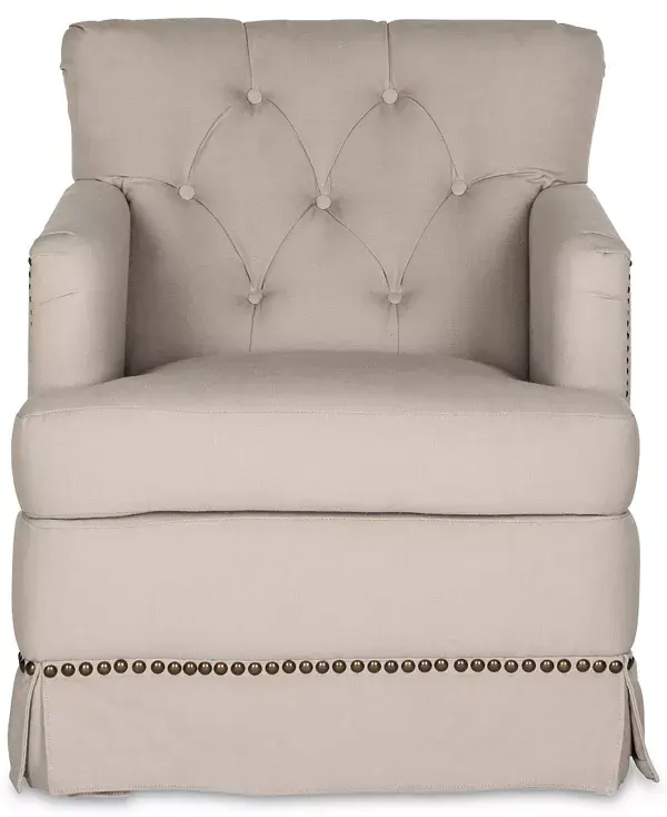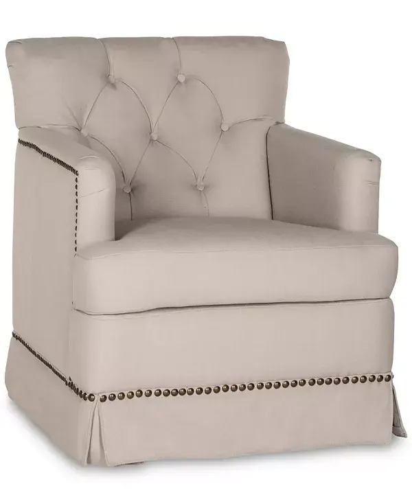 Классическая красота и роскошный комфорт, подобающие помещению в любом пространстве, воплощены в сиденье с пуговицами, декоративных шляпках и богатой льняной обивке этого великолепного кресла.