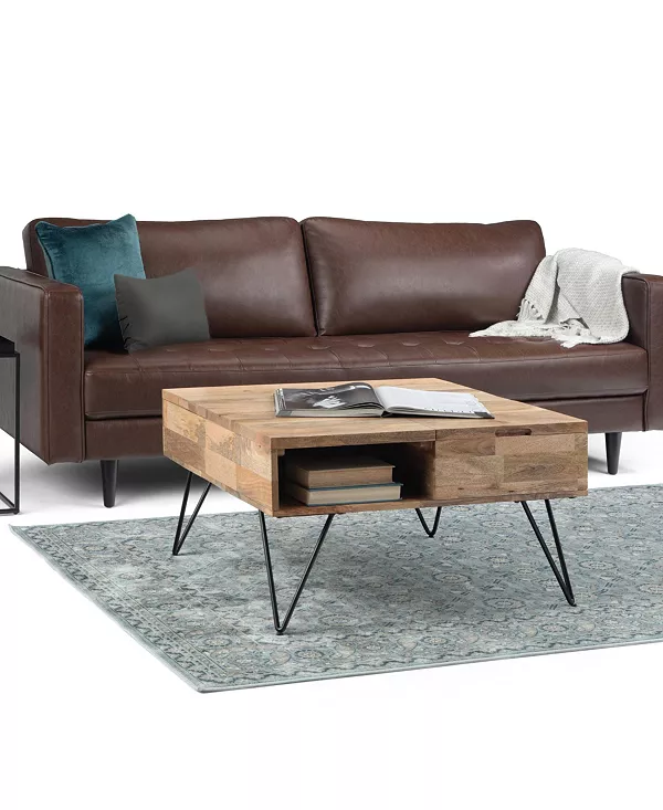 Этот уникальный журнальный столик Hunter Square Lift-Top сочетает в себе стиль и удобство. Столешница поднимается, открывая скрытое отделение для хранения, и легко перемещается к вам, создавая идеальную поверхность для работы на ноутбуке или еды перед телевизором. Столик оснащен двумя открытыми отделениями для книг или декоративных предметов. Черные железные ножки-шпильки в сочетании с натуральной отделкой мангового дерева добавляют индустриальный элемент.