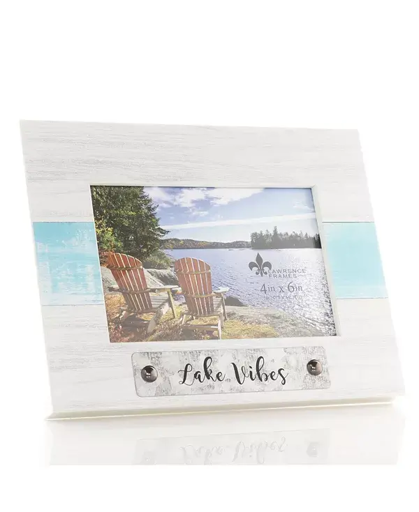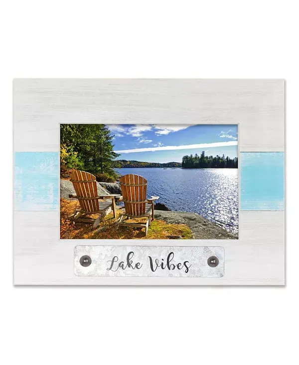 Декоративная рамка для фотографий с изображением озера в бело-голубых тонах с эффектом состаривания. Оцинкованная металлическая пластина внизу с черной надписью «Lake Vibes». Великолепная рамка для фотографий с изображением озера, которая украсит любую комнату и поместит в нее вашу любимую фотографию с озером. Высококачественная прочная конструкция.