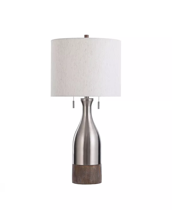 Эта современная настольная лампа превращает привычную форму в инновационное произведение искусства. Основание в форме бутылки из металла и полирезина сменяется абажуром из меланжевого льна в классическом цилиндре. Полирезина имеет отделку под дерево, что придает светильнику двухцветный вид, одновременно деревенский и изысканный.
