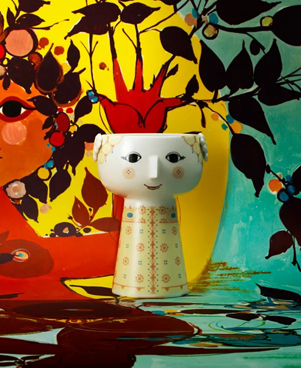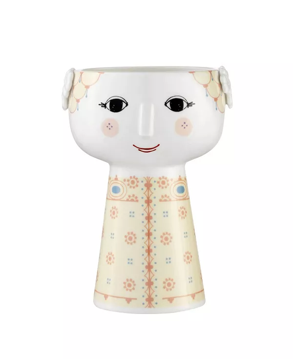 Великолепная ваза Eva в жёлтых тонах от Бьёрна Вайнблада идеально подходит для небольших букетов или свежего гиацинта. Ваза изготовлена из глянцевой глазурованной ткани с розовой наклейкой и элегантным рельефным цветочным узором с обеих сторон. Узор на вазе взят с работы Вайнблада: лицевая сторона – это оригинальный контур самых первых ваз Eva.