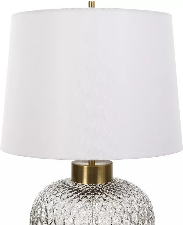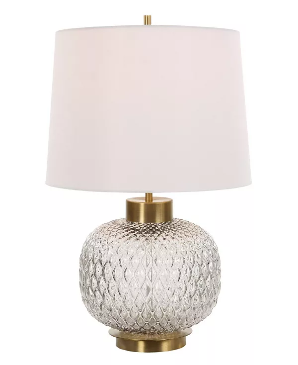 Настольная лампа Estelle имеет массивное круглое основание из светло-дымчатого стекла, напоминающее решетку, с рельефным узором, дополненное массивной ножкой и фурнитурой из антикварной латуни. Слегка сужающийся круглый абажур с твердой спинкой обтянут белоснежной льняной тканью.