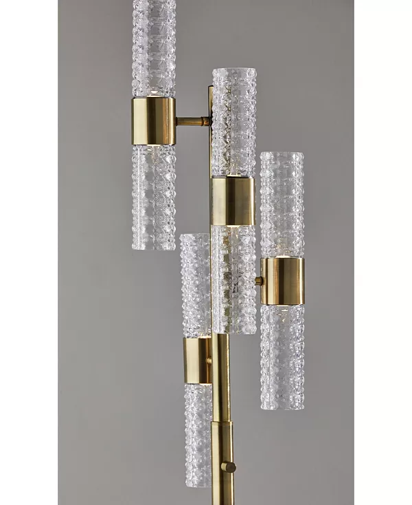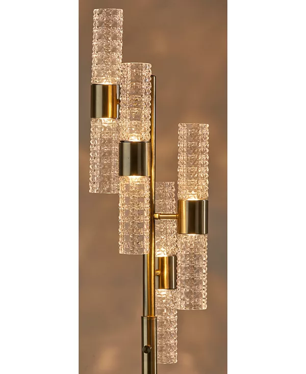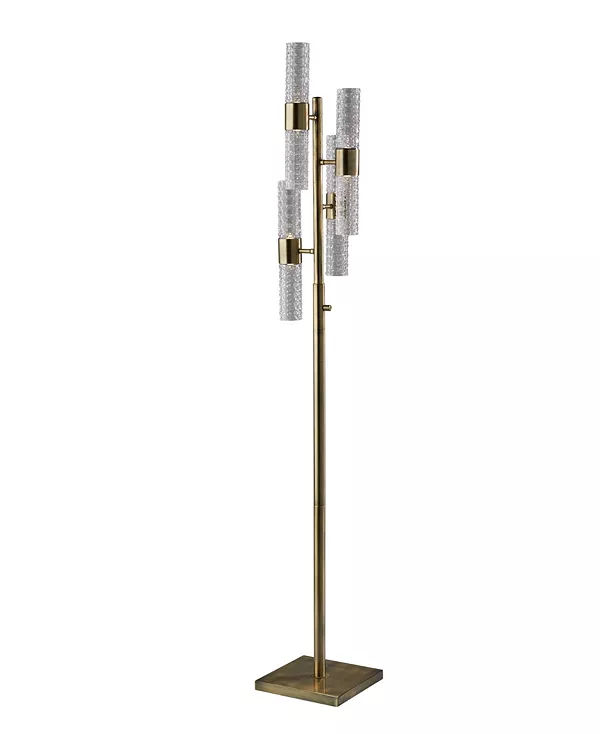 Привлеките внимание всех ваших гостей этим торшером. Элегантное латунное основание и стойка удерживают восемь высоких, тонких цилиндрических плафонов из текстурированного стекла, расположенных в шахматном порядке, создавая интригующий силуэт.