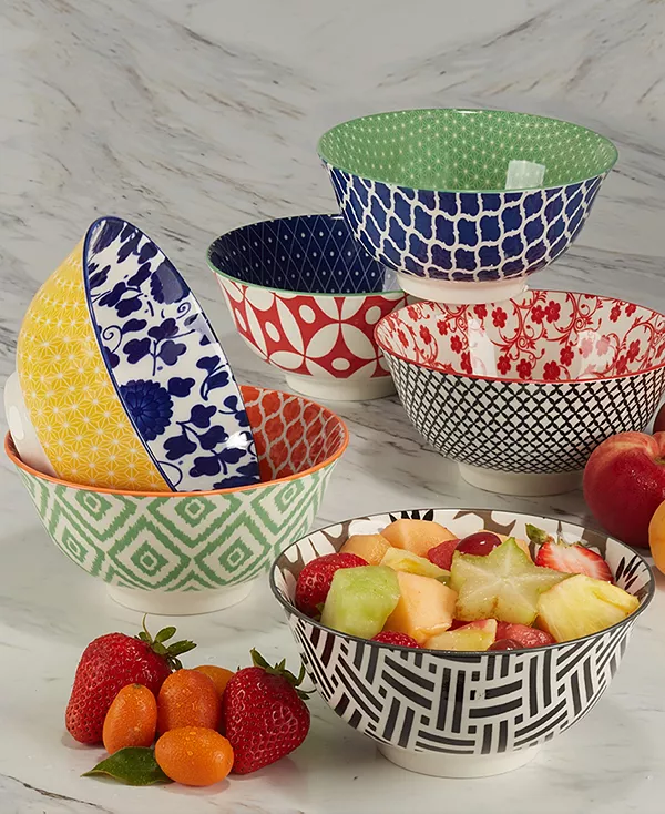 Набор из 6 универсальных мисок Soho с яркими цветочными и геометрическими узорами, которые можно комбинировать, станет отличным дополнением к любому столу. Эти прочные фарфоровые миски идеально подходят для подачи супа, салатов и мороженого, а также для приготовления пищи и угощения гостей. Вместительные (диаметр 15 см, глубина 7,5 см) можно мыть в посудомоечной машине и микроволновой печи.