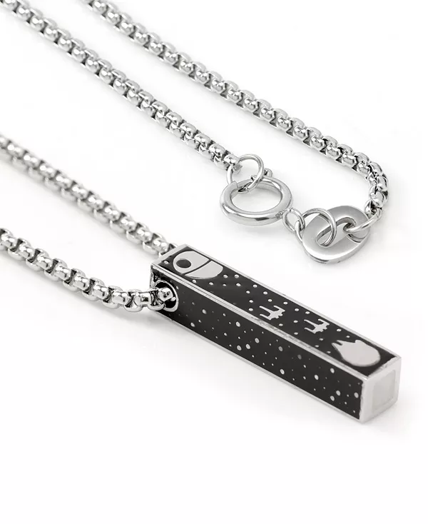 Этот прямоугольный кулон изображает атаку на Звезду Смерти, вселяя новую надежду. По обе стороны от сцены, выполненные из черной эмали, расположены рельефные звезды из нержавеющей стали, которые создают ощущение, будто вы вместе с Люком и «Тысячелетним соколом» на их миссии.