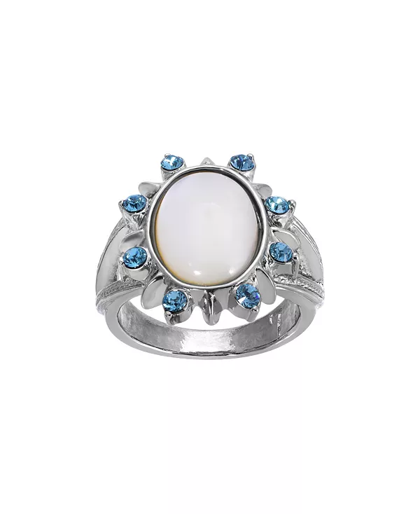 Фаворит весны и лета, кольцо с аквамарином, украшенное овальным гладким натуральным перламутром, украшенным сверкающими кристаллами аквамарина.