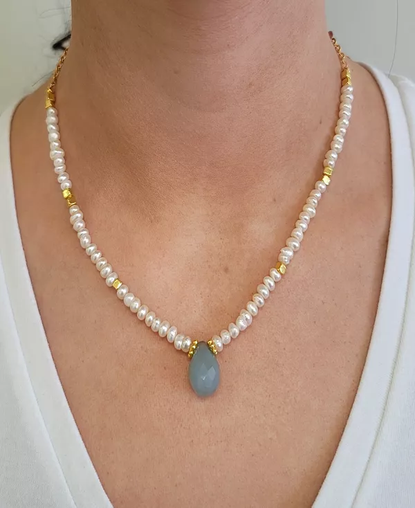 Необычный шик. Это эклектичное ожерелье MINU Jewels сочетает в себе подвеску из халцедона и цепочку, украшенную культивированным пресноводным жемчугом-пуговицей.