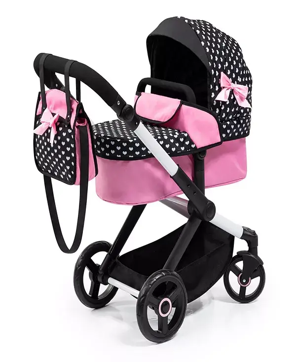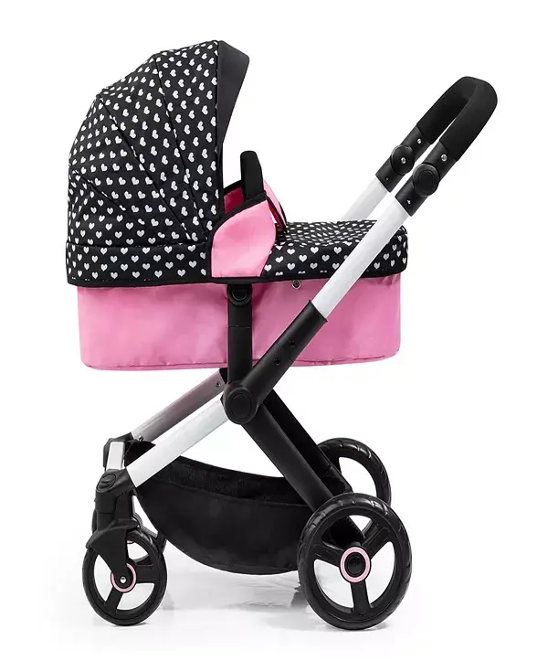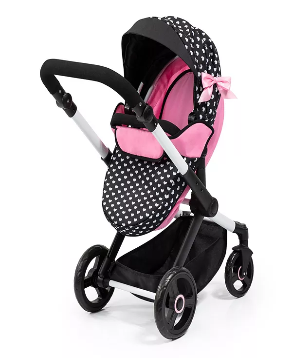 Детская коляска Xeo - сердечки - черно-розовый - комбинированная кукольная коляска Xeo имеет современный дизайн и подходит для кукол ростом до 20 дюймов (52 см). Благодаря регулируемой ручке эта кукольная коляска легко адаптируется к росту вашего ребенка, также можно установить люльку по ходу движения.