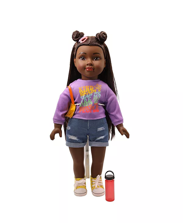 Детализированная кукла: Шайенн поставляется в стильной, но удобной фиолетовой рубашке с длинными рукавами с надписью «Добрые люди - мои любимые люди», синих джинсовых шортах и подходящих желтых туфлях.