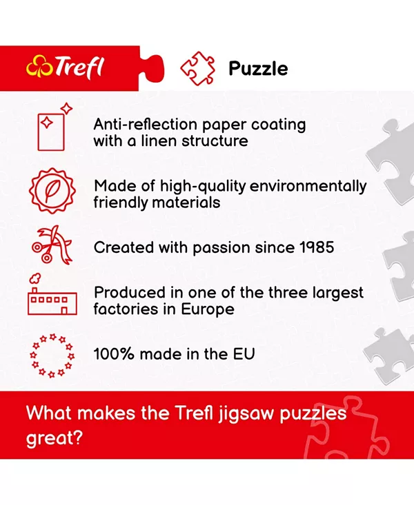 Хотите устроить приятный вечер дома? Пазлы — отличный способ провести свободное время с друзьями и семьёй, а также отличная тренировка для мозга. Они также станут идеальным подарком на день рождения или Рождество. Пазлы Trefl производятся в Польше исключительно из натуральных материалов. Специальная бумага с льняной структурой уменьшает отражение света и делает их удобными в использовании, даря вам ещё больше радости. Пазлы на 2000 деталей. Идеально подходят для любителей головоломок, позволяя собрать картину размером 961 x 682 мм. Детали изготовлены из высококачественных материалов с использованием бумаги, уменьшающей отражение света. Отлично тренируют память, развивают мелкую моторику и концентрацию, а также тренируют терпение и восприимчивость. Уникальный подарок для всех взрослых и детей старше 10 лет, которые увлекаются головоломками.
