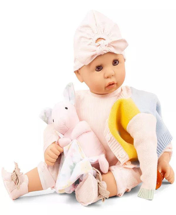 Gotz Cookie Farbspiel — куколка и милый компаньон-зайчик. Без волос и с карими спящими глазами. У Cookies летнее настроение. На ней тонкий полосатый комбинезон с длинными рукавами, удобная тканевая обувь и стильная шляпка с узлом.