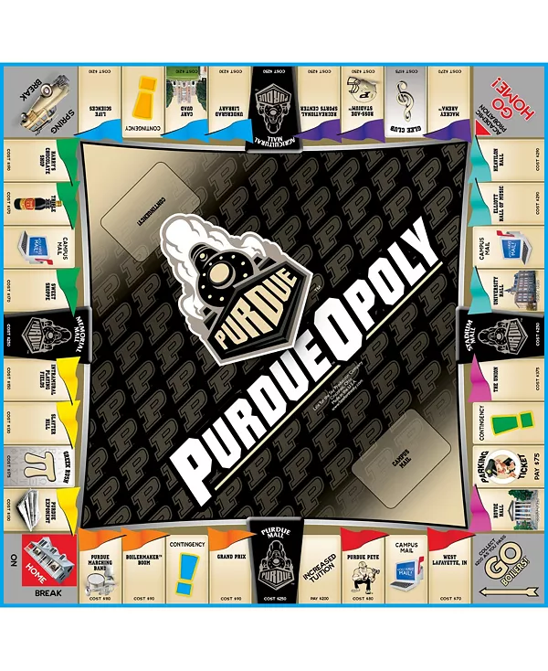 Эта настольная игра Purdueopoly идеально подходит для выпускников, студентов и будущих выпускников Университета Пердью. В набор входят фишки: будильник, карандаш, кроссовки, велосипед и выпускная шапочка. На игровом поле расположены следующие поля: Engineering Mall, Purdue Pete, Grand Prix, Purdue Exponent, Harry's Chocolate Shop и University Library.