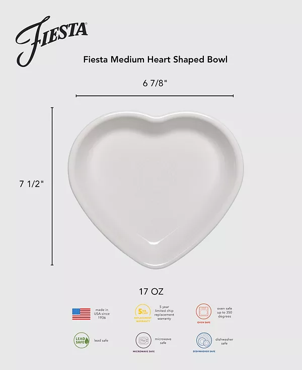 Добавьте романтики в ваш стол с этой чашей в форме сердца от Fiesta. Её очаровательная форма прекрасно сочетается с различными предметами Fiesta, включая обеденные тарелки, поэтому её можно использовать для подачи отдельных порций пасты или салатов.
