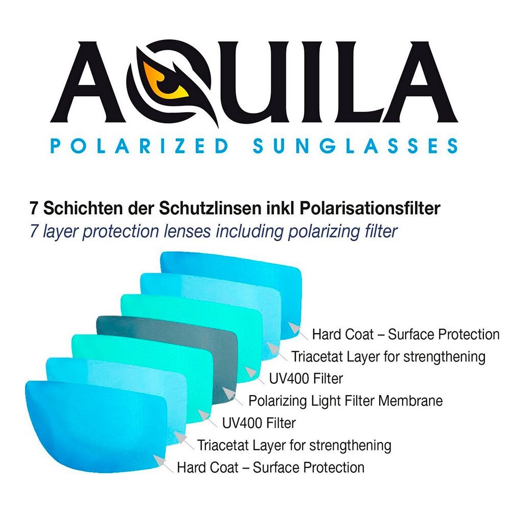 Линзы TAC: Линзы поляризационных очков AQUILA Premium изготовлены из триацетатного целлюлозного материала. Они состоят из 7 слоев (включая поляризационный слой), что обеспечивает идеальную защиту и кристально чистое изображение. Кроме того, линзы очень прочные и устойчивы к пыли и износу.