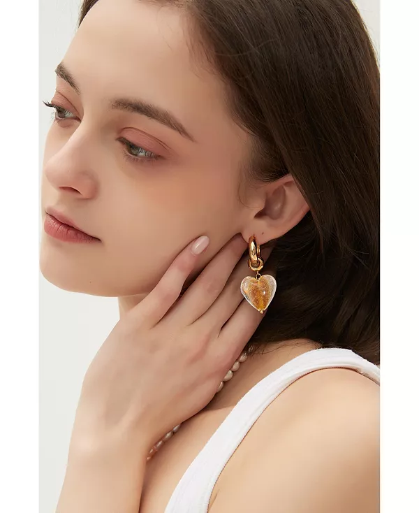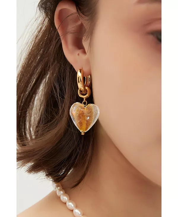 Эти серьги-подвески могут похвастаться сладким сочетанием насыщенных цветов с мерцающими золотыми крапинками, закрученными по всей длине. Подвески в форме сердца ручной работы, украшенные золотыми кольцами, делают серьги шикарными и современными в своей красоте. Цвета глазури достигаются путем добавления минералов в стекло и никогда не померкнут.