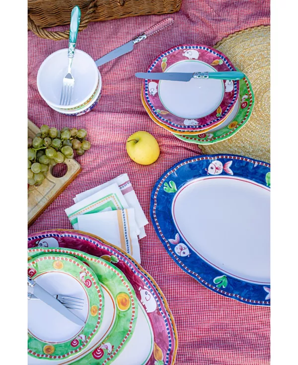 Овальное блюдо Campagna Pesce из меламина украшено нарисованными вручную рыбками, плавающими в глубоком синем море. Прочный материал делает его идеальным предметом сервировки для посиделок на свежем воздухе.