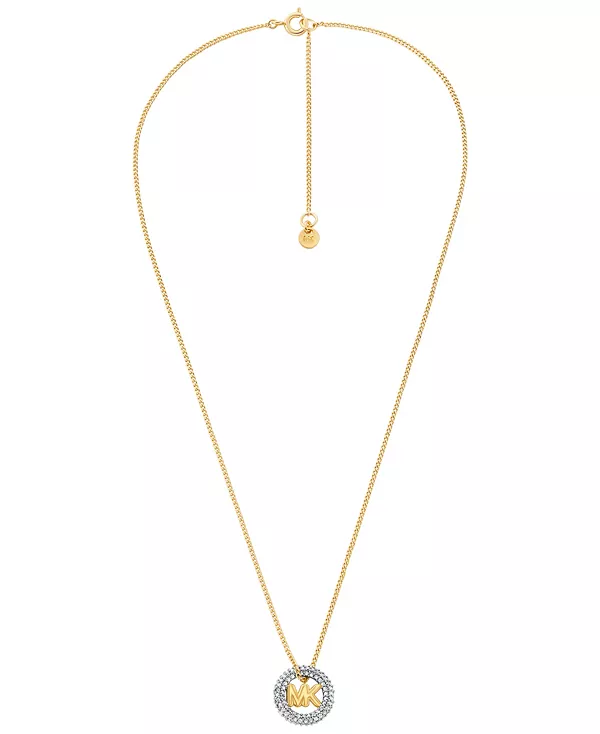 Коллекция украшений Kors MK посвящена жизни и творчеству Майкла, а фирменный логотип MK стал ключевым элементом дизайна. Это ожерелье с подвеской украшено золотистой цепочкой и логотипом, украшенными сверкающим паве. Благодаря масштабу и надежной застежке-кольцу оно идеально подходит для повседневного ношения.