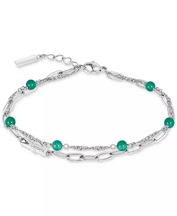 Этот браслет из коллекции Deva от Lacoste сочетает в себе полудрагоценные каменные бусины с витыми цепочками и цепочками-скрепками.