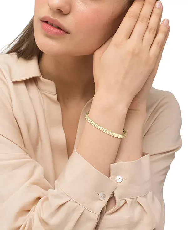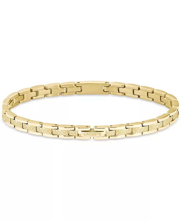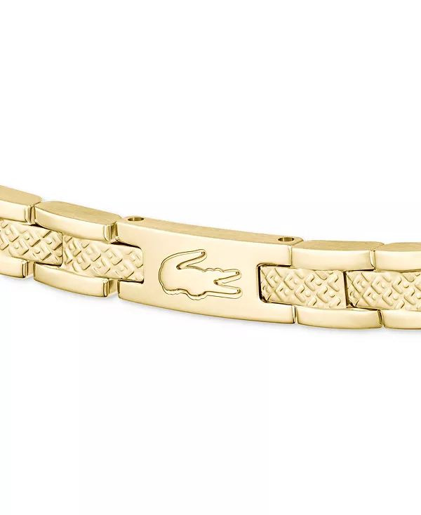 Фирменный браслет Lacoste Metropole выполнен из мягко закругленных H-образных звеньев и более крупного звена с логотипом в виде крокодила посередине.