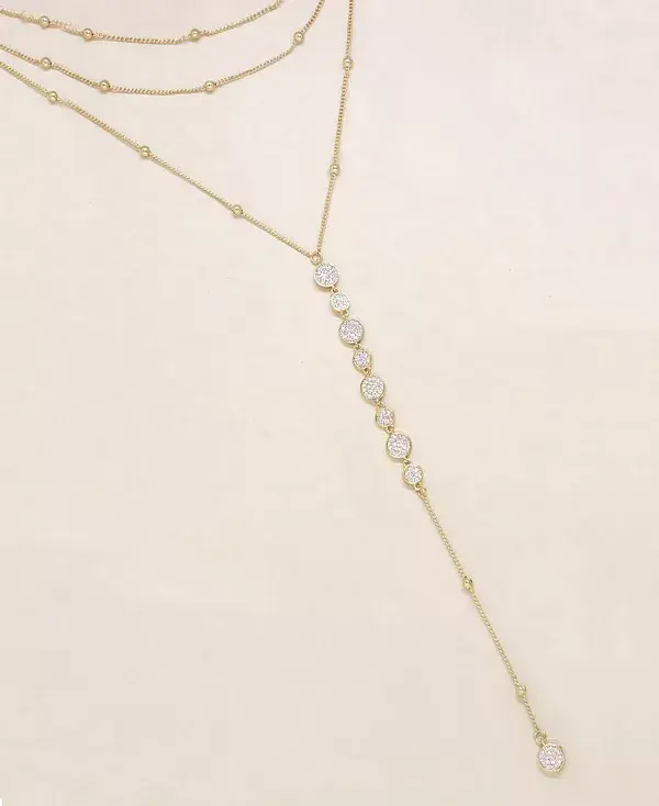 Это трёхслойное колье-лариат станет вашим любимым аксессуаром на любом мероприятии. Кубические циркониевые диски создают изысканный образ, который вам обязательно понравится.
