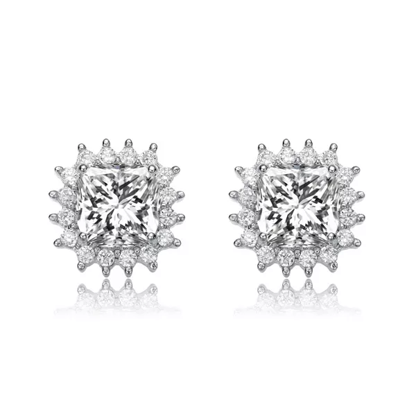 Элегантные серьги-гвоздики. Эти серьги-гвоздики диаметром 10 мм украшены крупным прозрачным сияющим камнем в оправе с четырьмя зубцами. Сияющий центральный камень дополнен более мелкими прозрачными круглыми камнями, разделенными двумя зубцами и одним на оправе. Серьги застегиваются на застежку-бабочку.