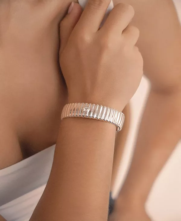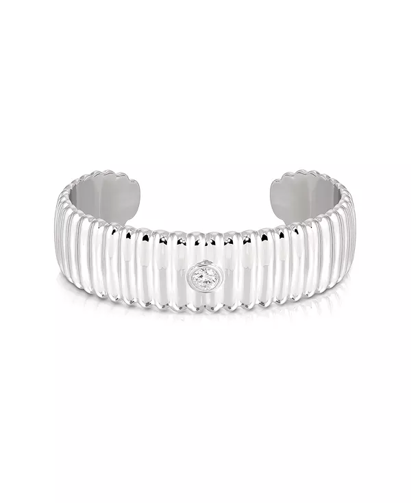 Элегантный и современный браслет-манжет Ribbed Crystal Cuff отличается открытым текстурированным дизайном с одним сверкающим кристаллом в центре, что придает ему изысканный минималистичный вид.