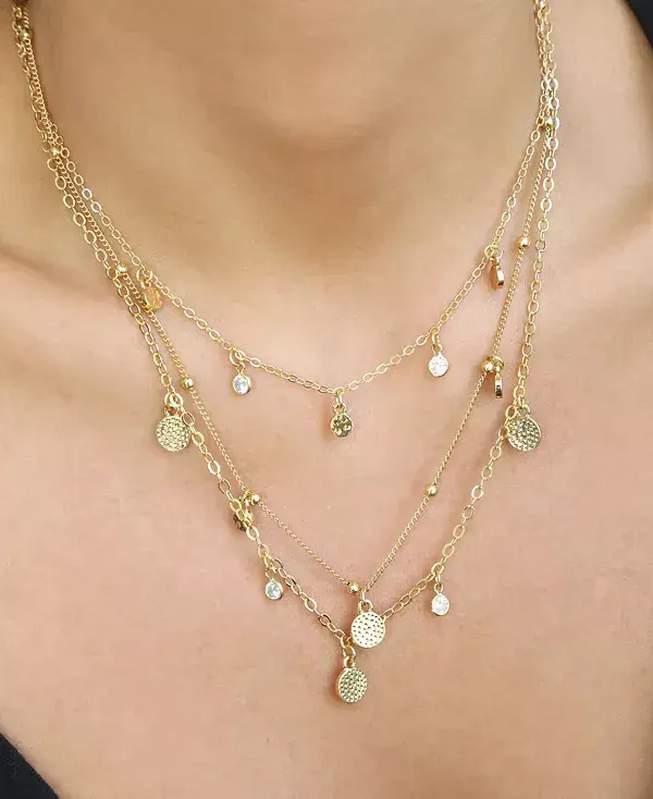 Создайте модный многослойный образ с этим изящным ожерельем с несколькими цепочками и подвесками в форме диска. Украшено кристаллами кубического циркония.