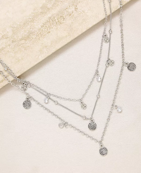 Создайте модный многослойный образ с этим изящным ожерельем с несколькими цепочками и подвесками в форме диска. Украшено кристаллами кубического циркония.
