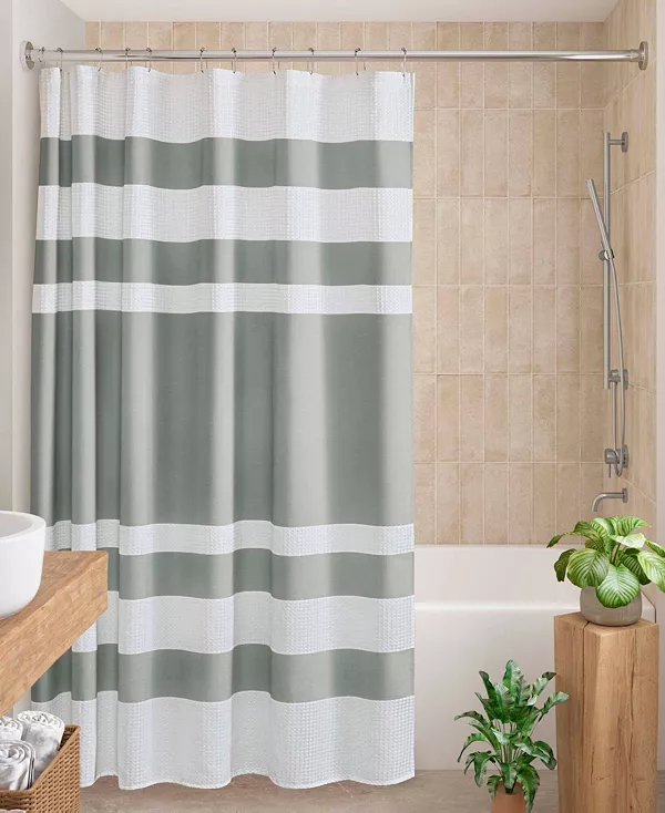 Эта занавеска для душа с ярким полосатым рисунком выполнена из светлой меланжевой ткани с белой вафельной основой, создающей красивую текстуру и идеально подходящей для вашего интерьера. Временная водоотталкивающая обработка 3M Scotchgard сохранит ваш вид надолго.