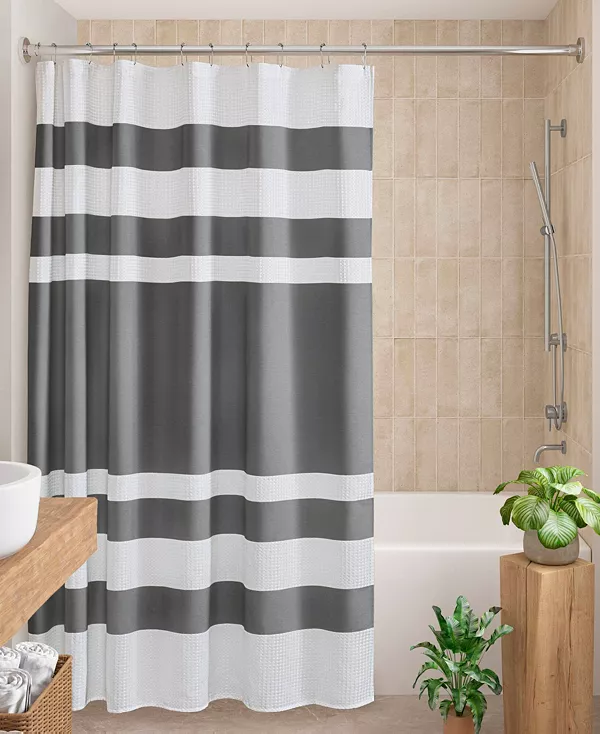 Эта занавеска для душа с ярким полосатым рисунком выполнена из светлой меланжевой ткани с белой вафельной основой, создающей красивую текстуру и идеально подходящей для вашего интерьера. Временная водоотталкивающая обработка 3M Scotchgard сохранит ваш вид надолго.