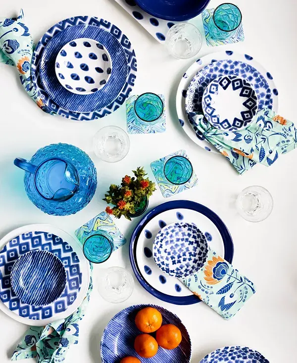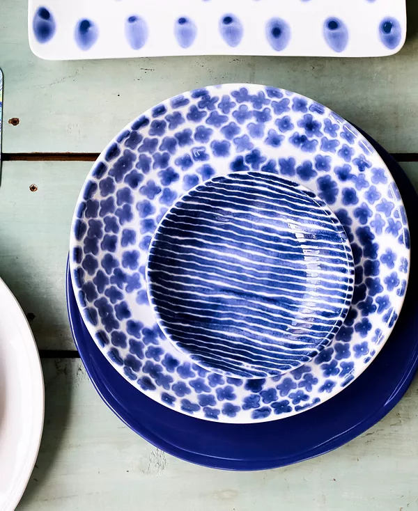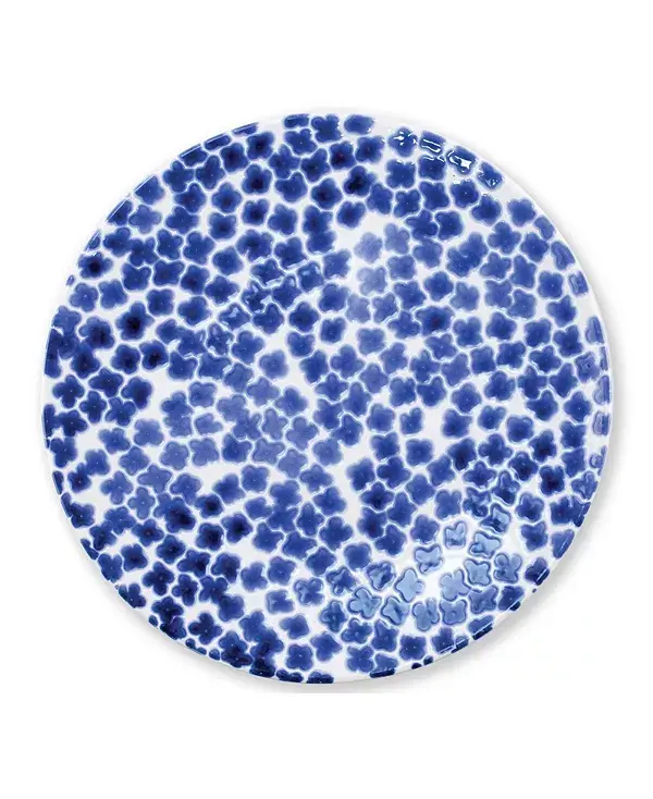 Воссоздайте прекрасную мозаику, найденную на греческих островах, с помощью тарелки Santorini, расписанной на твердой керамике в веселый сине-белый узор.