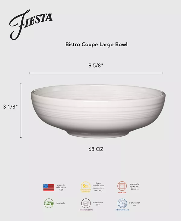 Возможно, название «Фиеста» было выбрано в 1936 году потому, что знаменитая коллекция представлена в таком количестве праздничных цветов. Простая в уходе сервировочная чаша Bistro легко сочетается с вашими любимыми узорами и оттенками, превращая повседневную трапезу в настоящее праздничное событие.