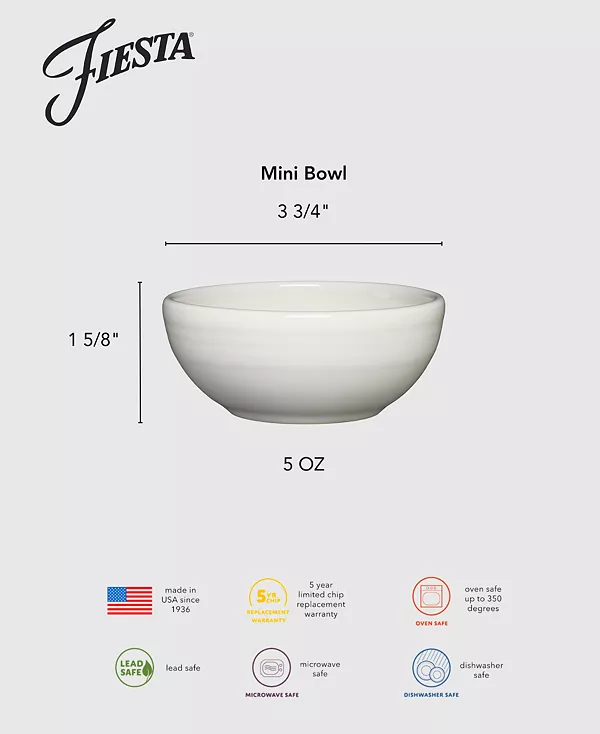 Эта керамическая мини-миска станет обязательным дополнением к вашей коллекции Fiesta. Она идеально подходит для подачи приправ и соусов на стол, а также закусок и десертов после еды.