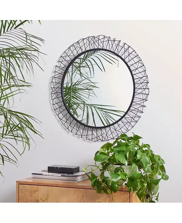 Это современное зеркало, созданное как произведение искусства, мгновенно станет центром внимания в гостиной или прихожей. Изготовленное из прочного железа, оно подчеркивает потрясающий замысловатый геометрический узор, обрамляющий круглое зеркало.