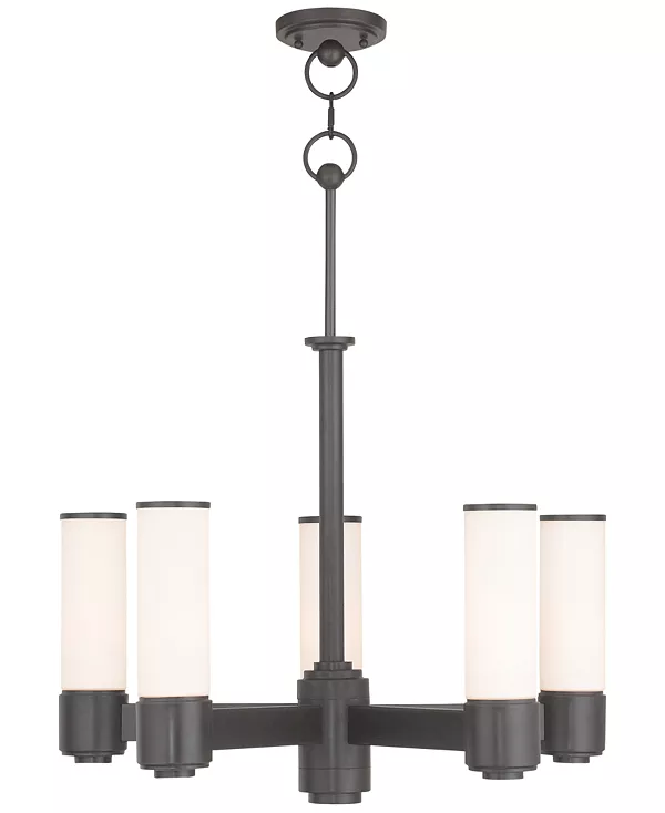 Традиционная конструкция получила современное звучание в люстре Weston ручной работы на 5 ламп от Livex. Квинтет выдувных стеклянных плафонов создает теплое свечение и уравновешивается темными тонами металлического основания.