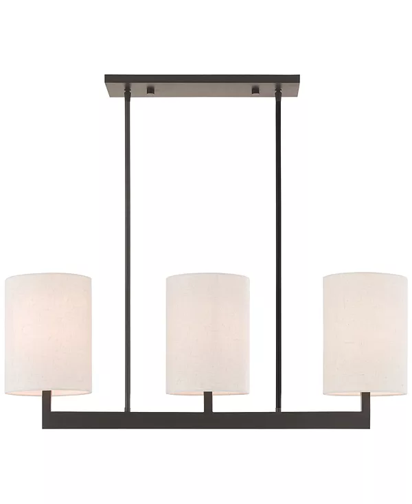 Изготовленные вручную цилиндрические абажуры кремового оттенка и элегантный современный дизайн трехламповой линейной люстры Hayworth ручной работы от Livex могут наполнить кухню или столовую ярким светом, создавая притягательный космополитичный стиль.