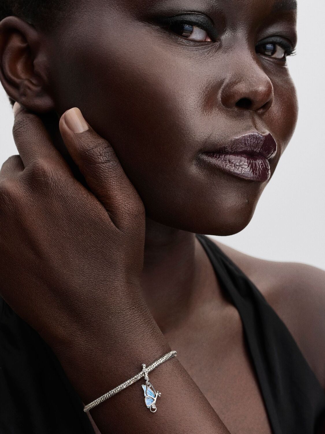 Откройте свои мечты с нашей подвеской-крылышком из стерлингового серебра. Голова и тело бабочки образуют ключ. Одно крыло ажурное, а другое украшено мерцающей эмалью и гравировкой ОТКРОЙ ЗАВТРАШНИЙ ДЕНЬ.
