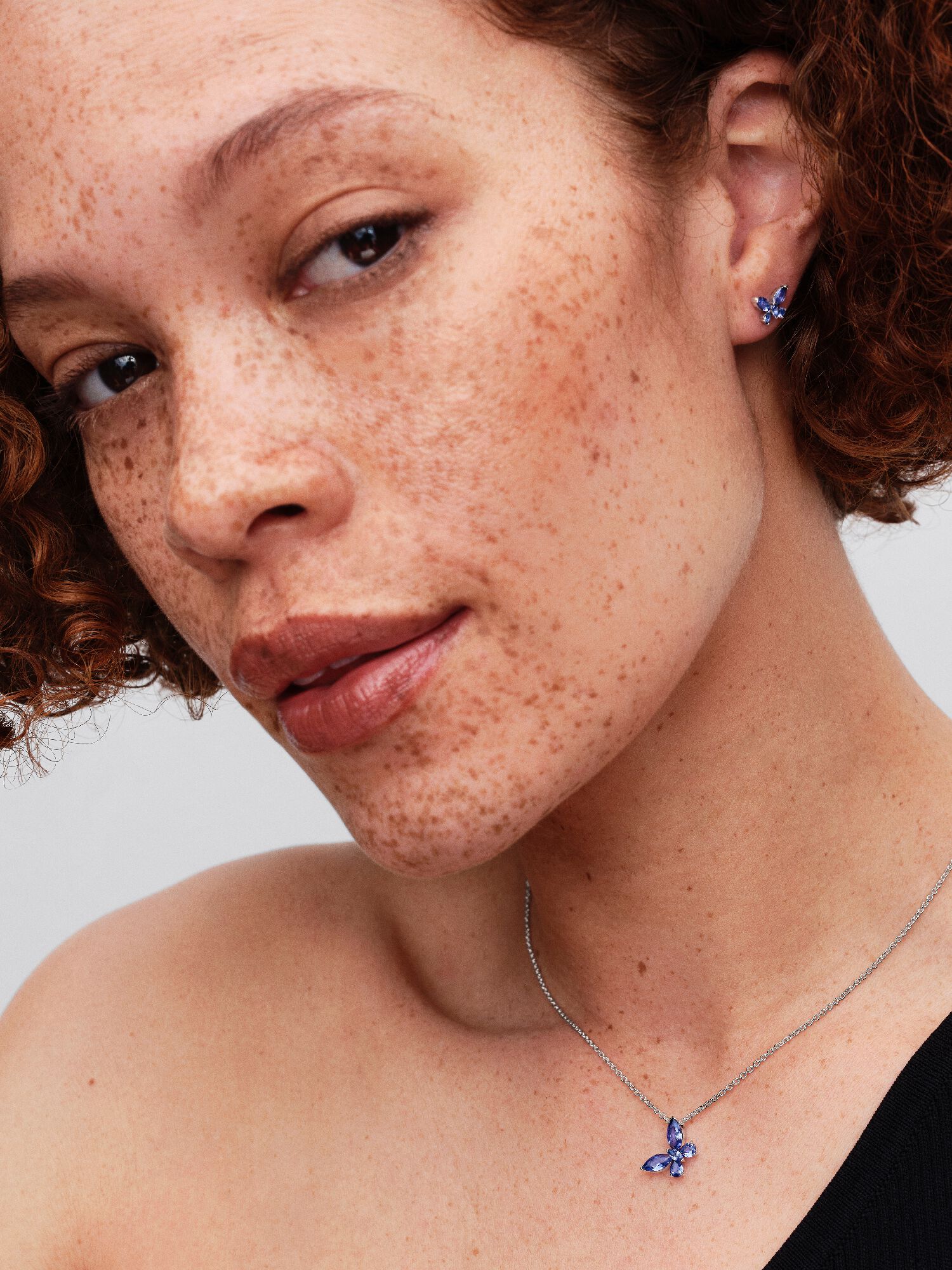 Расправьте крылья и преобразите свой образ с этим серебряным ожерельем. На цепочке изящно свисает бабочка, украшенная синими искусственными кристаллами огранки маркиз и грушевидной формы.