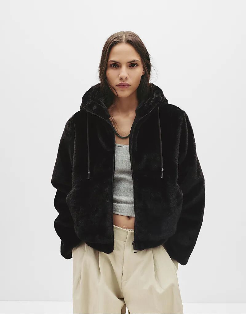 Куртка с капюшоном из искусственного меха Pull&Bear черного цвета