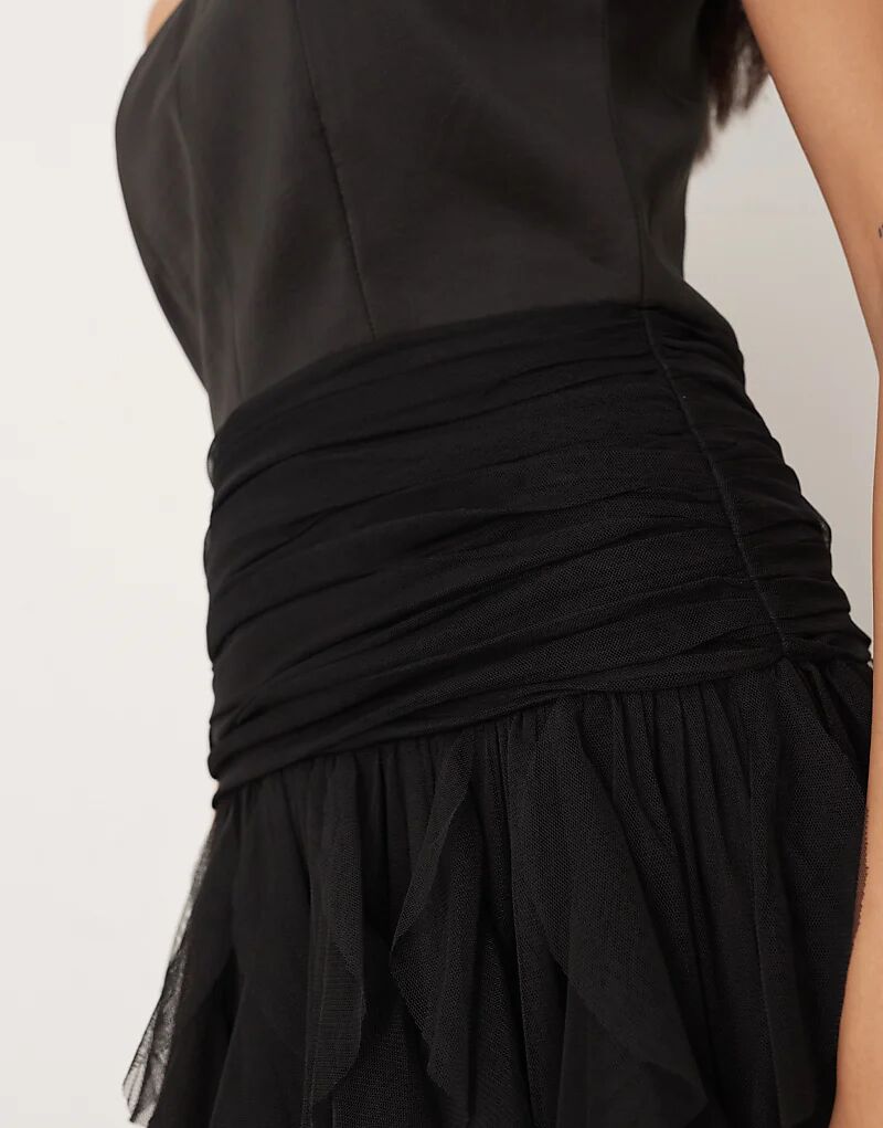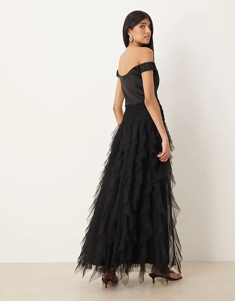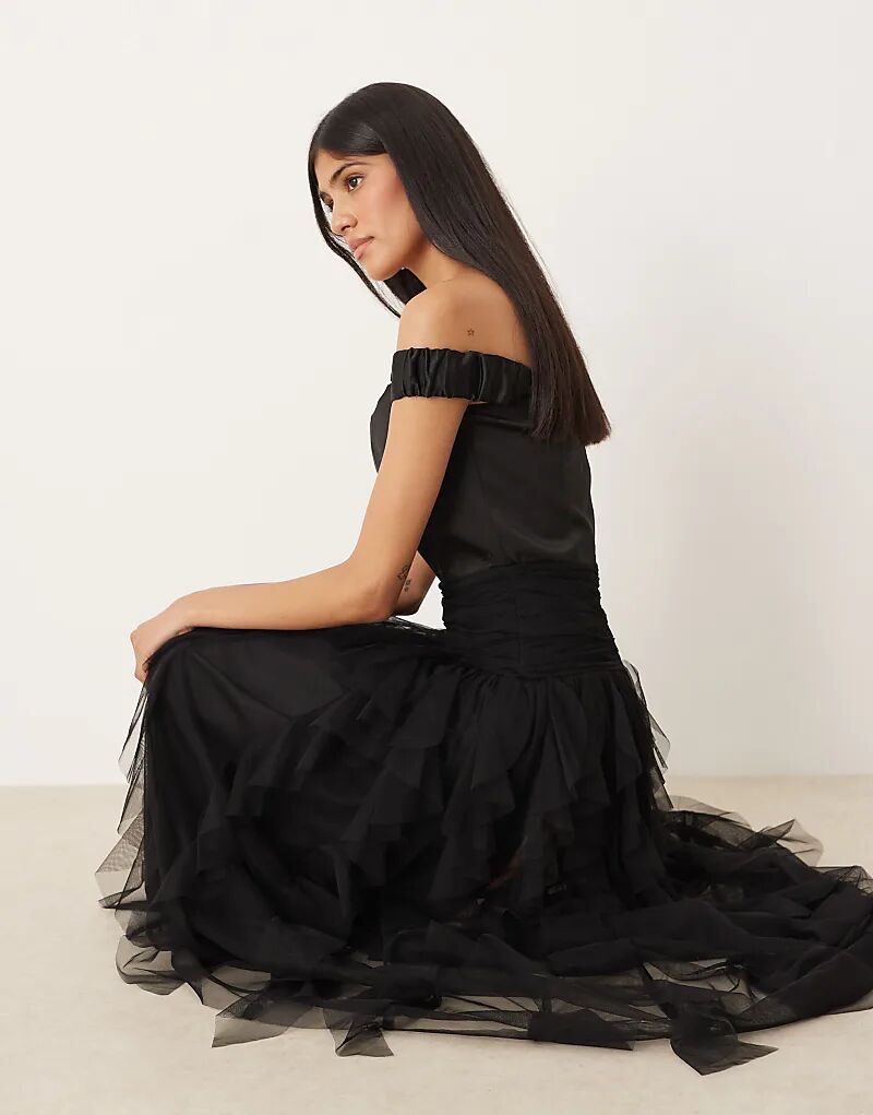 Платье макси с кружевом и бисером, драпированным подолом, черного цвета