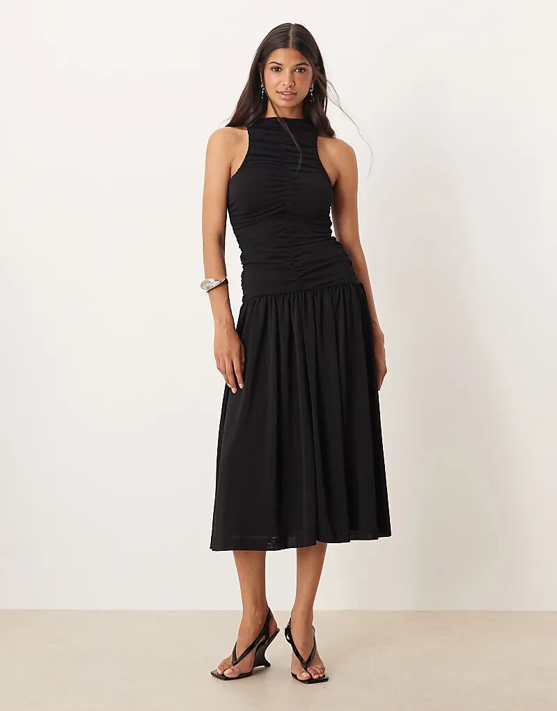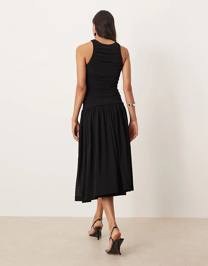 Платье мидакси Mango с заниженным подолом и сборками, черное