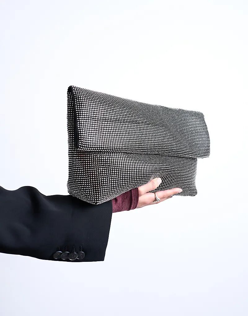 Клатч Georgia выполнен из тканого материала и украшен стразами. Модель имеет свободный крой и отложной верх.
