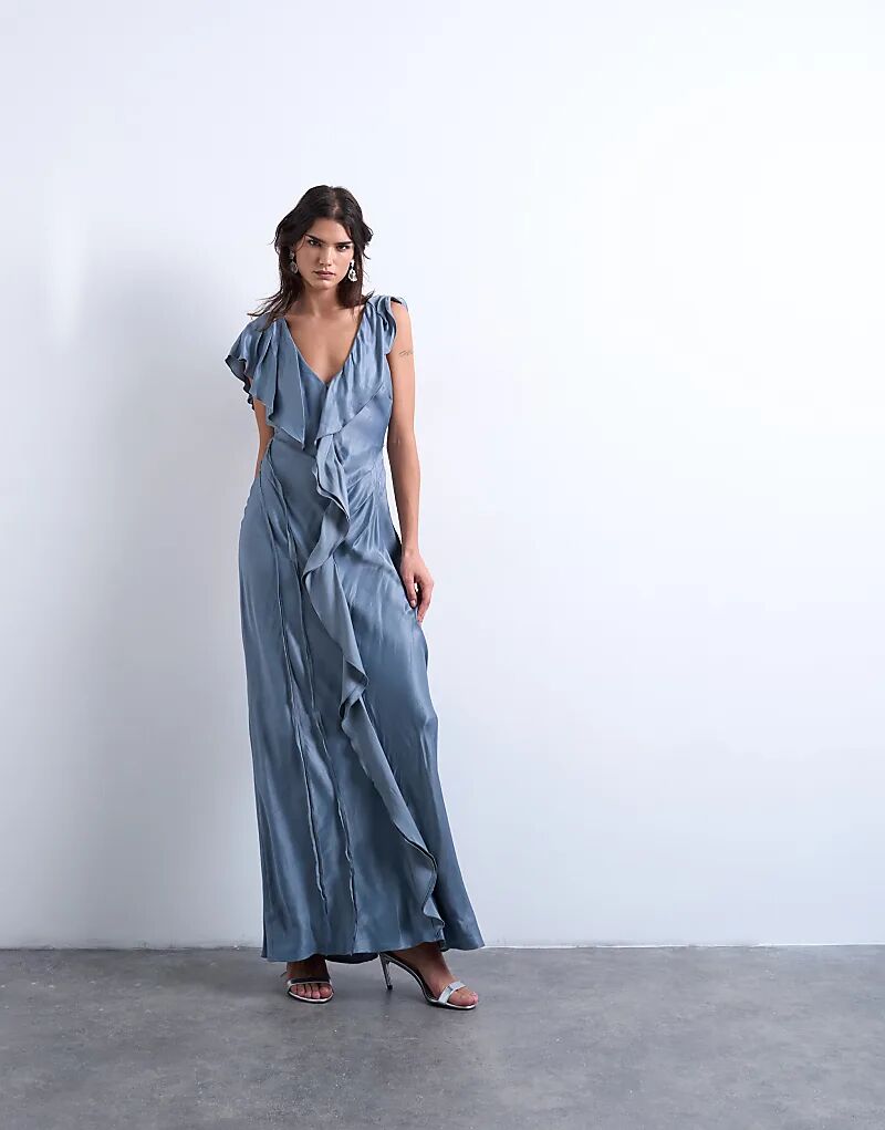Это платье из блестящей атласной ткани с глубоким V-образным вырезом, рукавами-крылышками и оборками с необработанными швами. Платье облегающего кроя красиво ниспадает до пола.