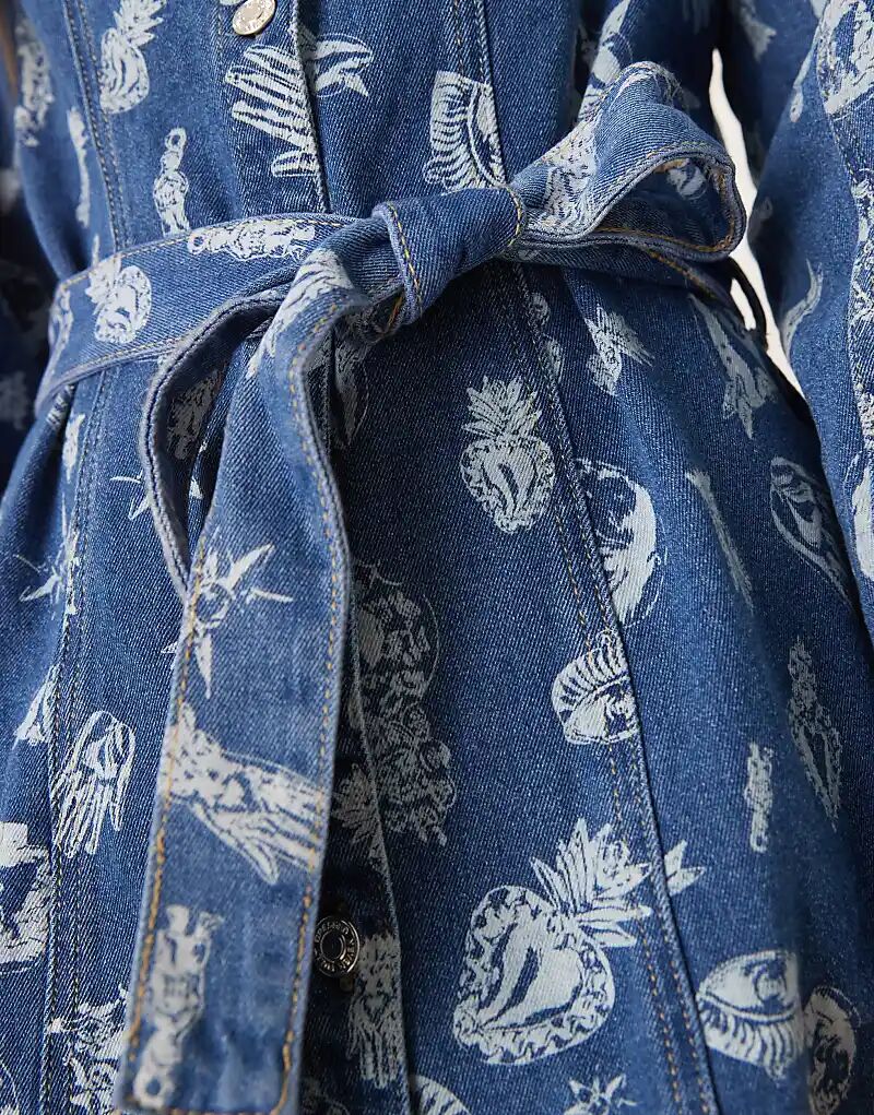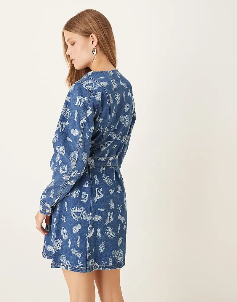 Мини-платье из денима Never Fully Dressed с завязкой на талии и синим узором